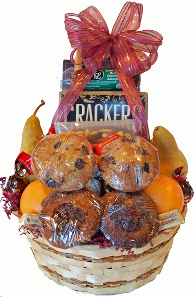 If you have a student, help them keep their mind on their studies by nourishing them with four Orchard Fresh Fruits, four delicious Homemade Muffins, a box of European Cafe Musica Cookies, Cheese, Crackers, Summer Sausage, 11/2 pound Mixed Nuts, eight individually wrapped Italian Chocolates and eight Truffles.