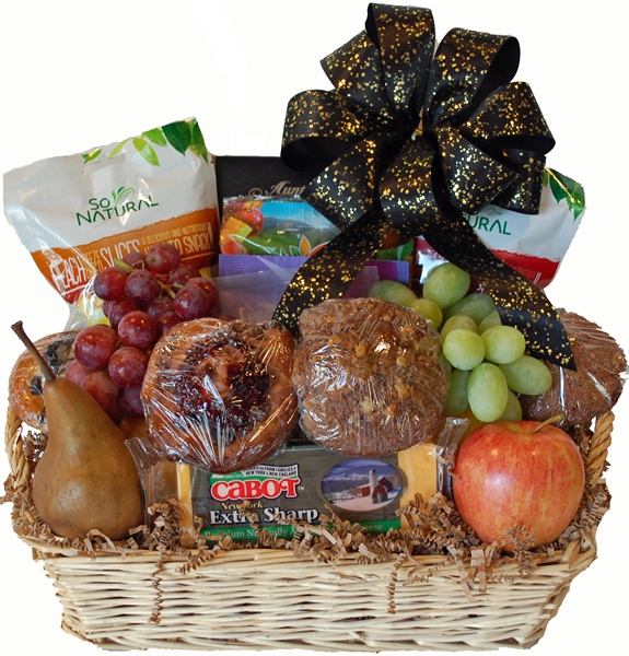 This lovely gift contains Cheese, Crackers, 4 of our Homemade Muffins, Trail Mix, 2 pieces of Fresh Fruit, 2 kinds of Grapes, 3 different Dried Fruits, 1/4 lb of Cashews.