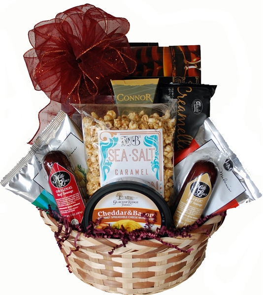 This basket has just about everything: a large Box of Chocolates, Cookies, Shortbread, Cheese, Crackers, 2 Summer Sausages, Cheese Straws, Soup Mix and Sea Salt Caramel Popcorn.