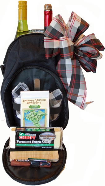 We've taken one of our best selling Insulated Back Packs, added a Bottle of Red, a Bottle of White, Cheese, Hand Made Wine Crackers and attached a big Hand Made Bow. This Brava Insulated Back Pack comes equipped with a Wooden Cutting Board, Cheese Board, 2 Acrylic Goblets, Cotton Napkins and a Corkscrew Bottle Opener.