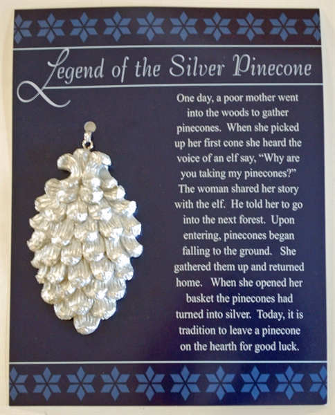 This Silver Pinecone Ornament makes a lovely addition to an ornament colection. Perfect as a stocking stuffer, small office gift exchanges the mail man, hairdresser..... The accompanying card explains whya pinecone placed on the hearth can bring good luck. Purchase as a stand-alone gift, or add to a gift basket.