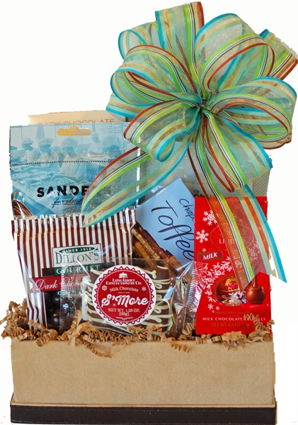 This sweet gift includes Moose Munch, a bag of Sanders Chocolate Sea Salt Caramels, Chocolate Covered Peanuts, a box of Truffles, Dillons Dark Chocolate Covered Cherries, Toffee and a Milk Chocolate S'More.