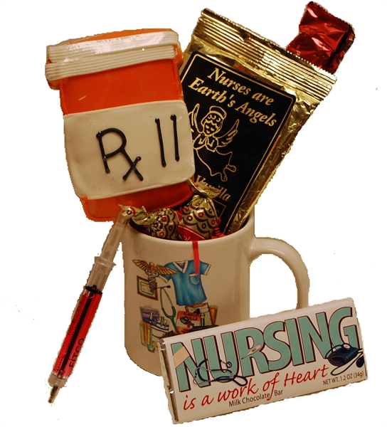Show your appreciation to the hardworking Nurse's Aid on your gift list with this Occupational Mug filled with a large Hand Decorated Prescription Bottle Sugar Cookie, Nurses are Earth’s Angels Coffee, Nursing Chocolate Bar, a Hypodermic Needle Pen, Pirouline Cookies and Chocolate Bonbons.