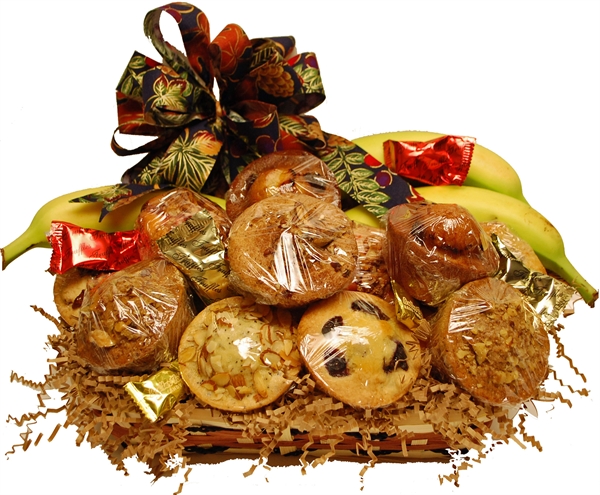 This beautiful presentation is perfect for any occasion. 12 individually wrapped Home Made Muffins, 12 Home Made Cookies and 8 pieces of Fresh Fruit topped with wrapped Truffles & Candies.