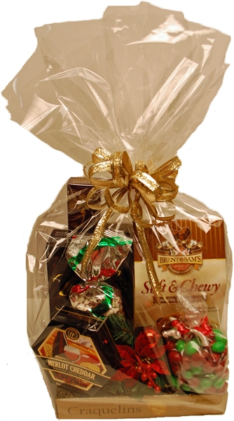 A gift box of Deluxe Mixed Nuts supports the back of this great stack which includes a large box of Truffles, a box of individually wrapped Chocolate Chunk Cookies, Cheese, Crackers, Guittard Smooth & Melty Mints, Wafer Cookies & M & M’s