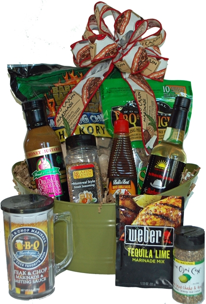 We've filled a handled plastic tub with large bags of Hickory Chips and Mesquite Chips to build a great flavorful fire and added lots of Spices, Rubs and Seasonings to get your choice of protein plenty tasty. When the lucky recepient has finished cooking, he can fill the tub with ice and his favorite brew :)