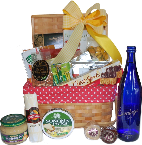 This Picnic Basket is overflowing with Cheese, Crackers, Summer Sausage, Cheese Straws, Hummus, Focaccia Crisps, Nuts, Trail Mix, Dried Veggies, Cookies, Candy and more