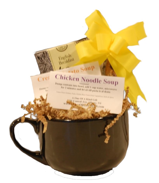 We've filled this large Soup Mug with two of our Homemade Dry Soup Mixes that just need water added, a box of Five English Breakfast Teas and Biscotti.