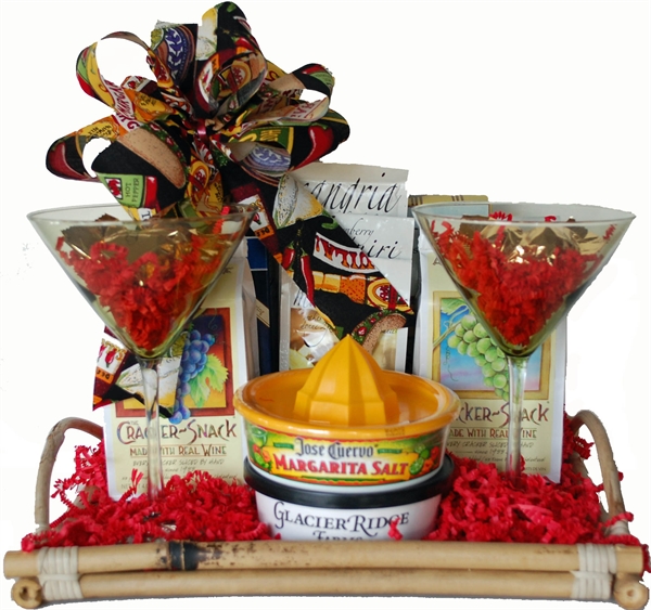 Basket includes 2 Margarita Glasses, Margarita Rim Salt, Drink Mixes, two different Flavors of Hand Made Wine Crackers, Cheese, Crackers and Truffles all on a Serving Tray.