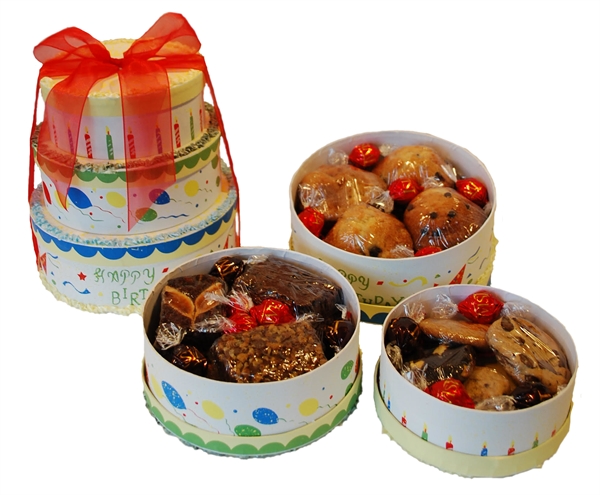 This unique Birthday Cake Gift Tower is filled with our delicious from scratch baked goods: 4 Muffins, 6 Brownies, 8 Cookies and 14 Truffles.