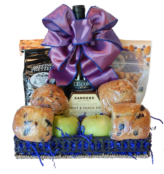 A lovely Reusable Tray filled with a Bottle of Wine, (let us know if you;d like Red or White), 2 different packages of Almond Cookies, Gourmet Dipping Pretzels, Chocolate Fruit & Snack Dip, 2 pieces of Fresh Fruit, 4 of our delicious Homemade Muffins and 1/2 lb of Cashews.