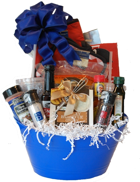 We've packed a Reusable Waterproof Handled Tub (great for ice & beverages) with everything you need to prepare, flip and serve your barbecued choice of protein. A matching set of BBQ Mitts & Hand Towel, Grill Spatula & Tongs, Smoking Chips, 2 Cold Drink Travel Cups, BBQ Dip Mix, Salt & Pepper Grinders, 3 different Steak & BBQ Sauces, Meat Tenderizer, Olive Oil and our own Homemade Dry Pork Rub.