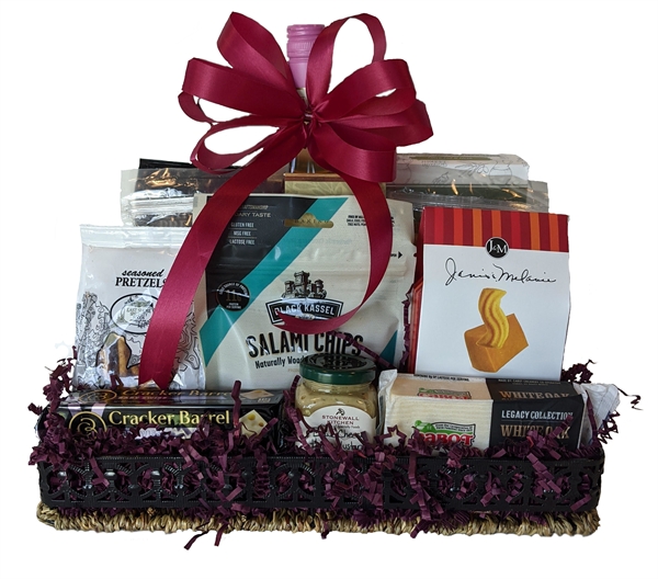 Your choice of Red or White Wine, Artisan Crackers, Dipping Pretzels, Gourment Mustard, 1/2 lb Cashews, 1/2 lb Smoked Almonds, Wine & Cheese Crackers, Salami Chips, Seasoned Pretzels, Cheese Straws and 2 different 1/2 lb Blocks of Cheese all arranged on a nice Reusable Tray.