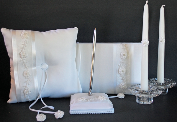 Pair of Decorated Tapers with Holders, Ring Pillow, Pen Holder with Silver Pen, Guest Book