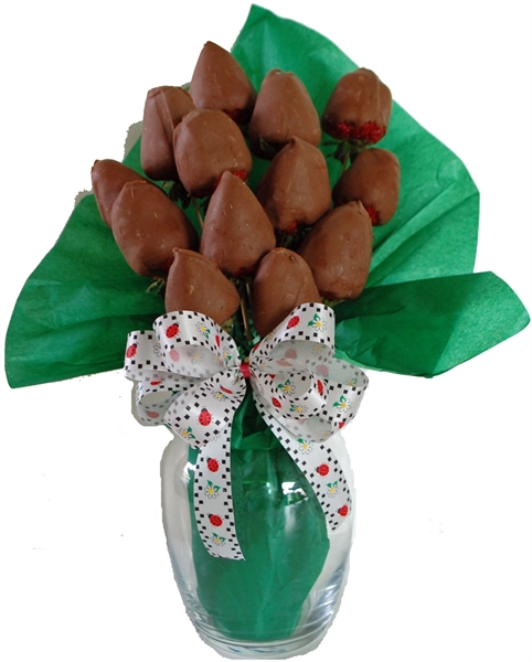 A Beautiful Presentation of 13 Freshly Dipped Strawberries arranged in a glass vase, wrapped with cello and tied with a bow. A traditional Valentine's Days Gift which is also perfect for almost any ocassion.