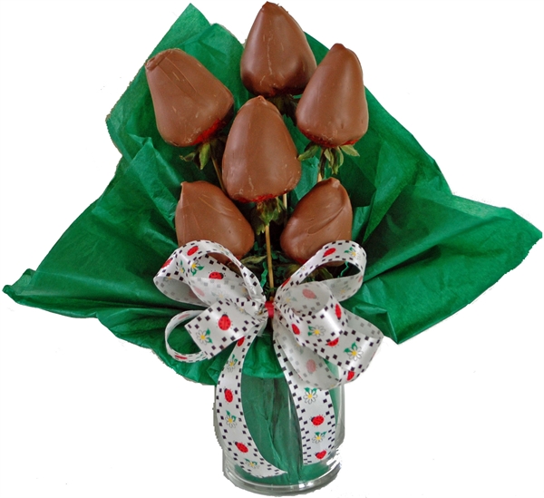 Six Freshly Dipped Strawberries arranged in a flower pot or glass vase, wrapped with cello and tied with a bow. A traditional Valentine's Days Gift which is also perfect for almost any ocassion.