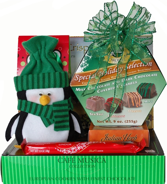 This cute little Plush Penguin Draw-String Bag holds M & M's. We've placed him on top of a large box of Chocolate Dipped European Cookies, and added Cheese, Focaccia Crisps, Moose Munch, a box of Chocolate Covered Caramels and a Lindt Chocolate Bar.