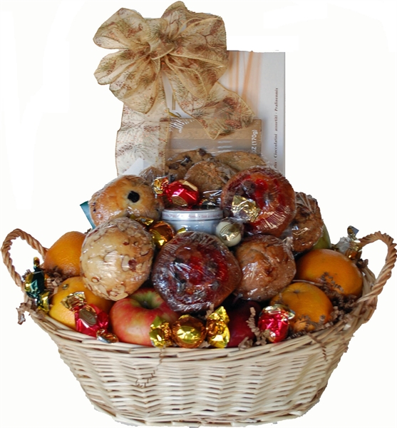 Convey your sympathy with this large basket overflowing with Homamade Muffins and Cookies, Fresh Fruit, Piroulines, a large box of Assorted Pralines, Chocolate Covered Nutty Turtles and Truffles.