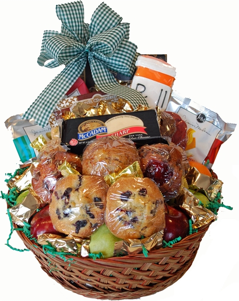 We've included six Home Made Cookies, six Home Made Muffins, six pieces of Orchard Fresh Fruit, Cheese, Crackers, Gourmet Chips, Cheese Straws, Dark Chocolate Sea Salt Toffee, Hard Candies, Truffles and a Hand Decorated Prescription Bottle Cookie.