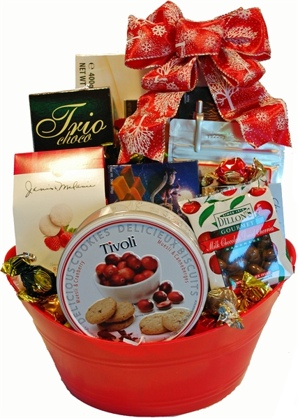 Need a gift for a group to share ? We've filled a bright red plastic tub with five different boxes/tins of Cookies, Milk Chocolate Covered Cherries, Toffee, Chocolates, Truffles, a Christmas Snack Mix and Caramels.